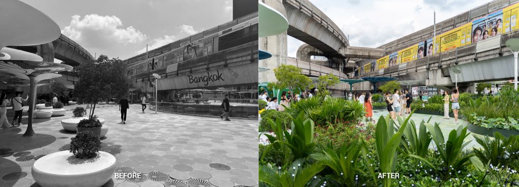 Shma, in collaboration with Garnier, -a leading brand in the natural beauty industry- and Bangkok Metropolitan, created a 550-square-meter park on the busy “Pathumwan” skywalk. The project aims to show how green spaces can be part of our daily life. This space has the potential to slow down the pace of life in this public transportation hub, providing meeting points and creating a pleasant environment for passersby. Hop-Park is a prototype that can later be adapted to other areas.