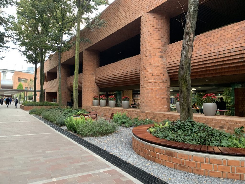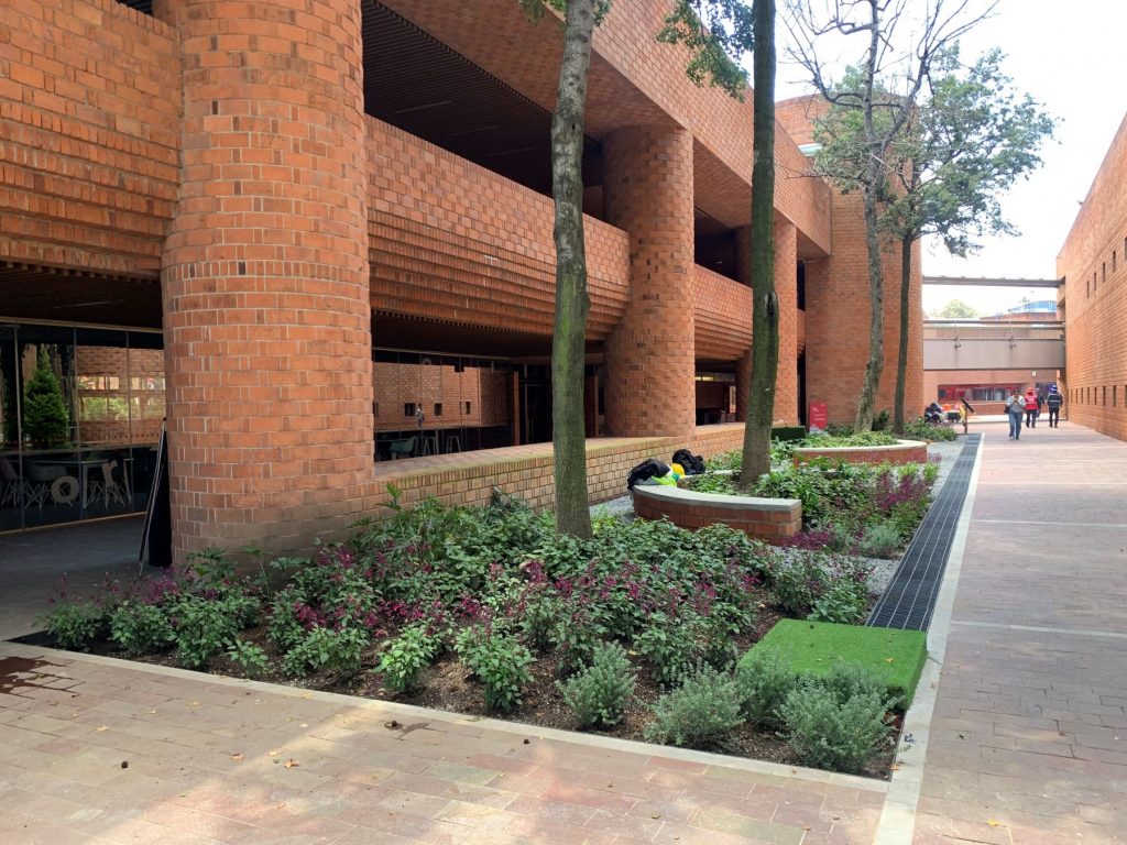 La intervención activa aproximadamente 3.9 ha de áreas verdes del campus a través de un “hilo conductor” que conecta plazas, jardines, corredores y plazoletas en una secuencia coherente, legible y accesible.