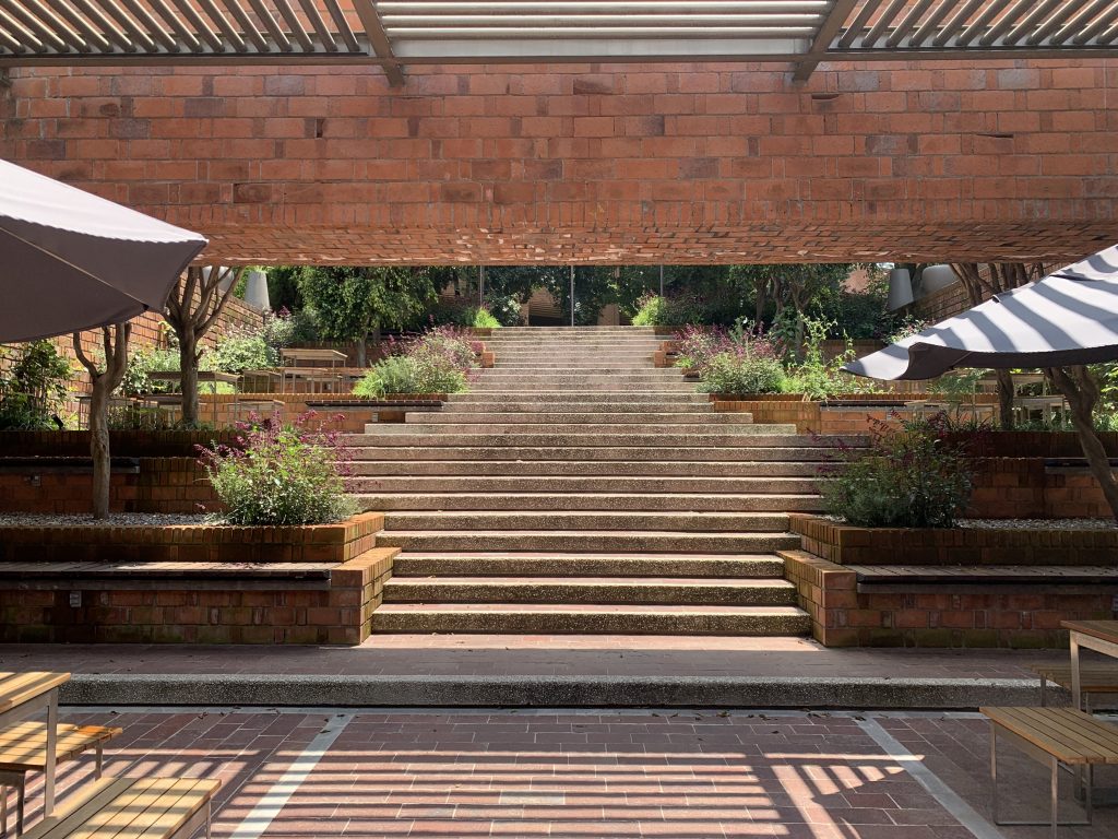 Así, el paisaje no sólo articula el espacio y dialoga con los edificios que lo rodean, sino que fortalece la identidad institucional y el sentido de pertenencia, incorporando también elementos de señalética y mobiliario que prolongan y consolidan este lenguaje.