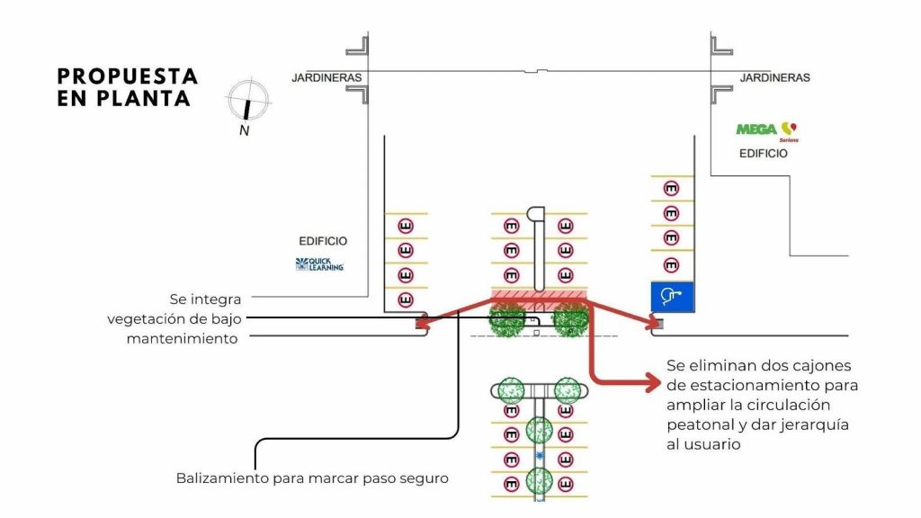 Se eliminan dos cajones de estacionamiento para ampliar la franja peatonal y priorizar al usuario.