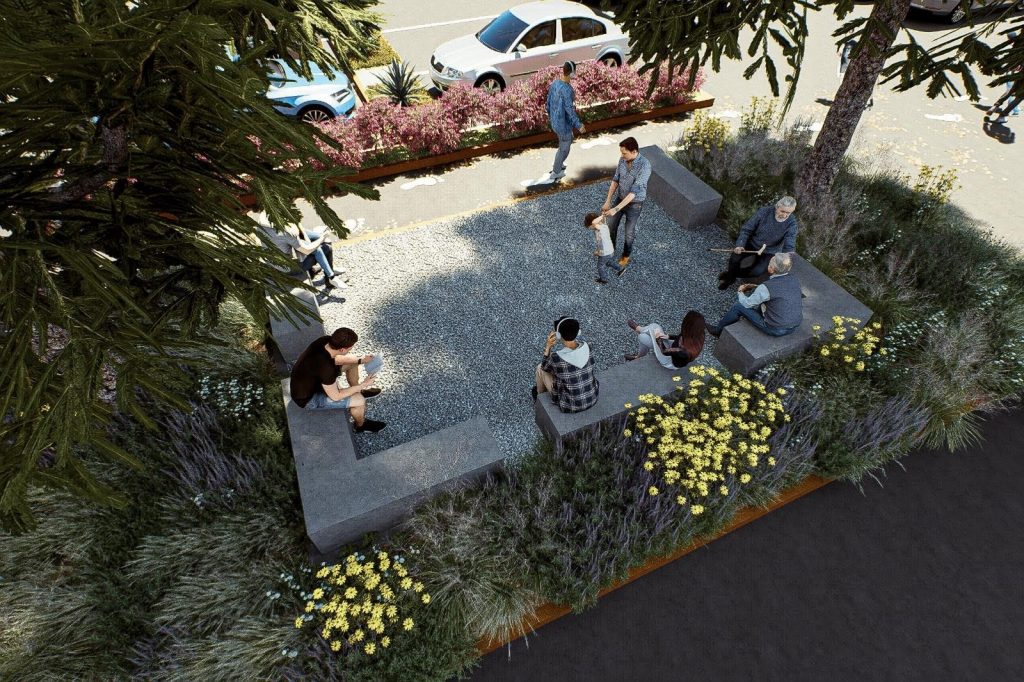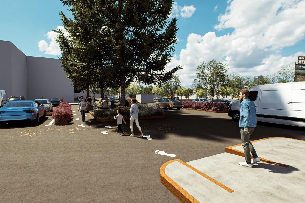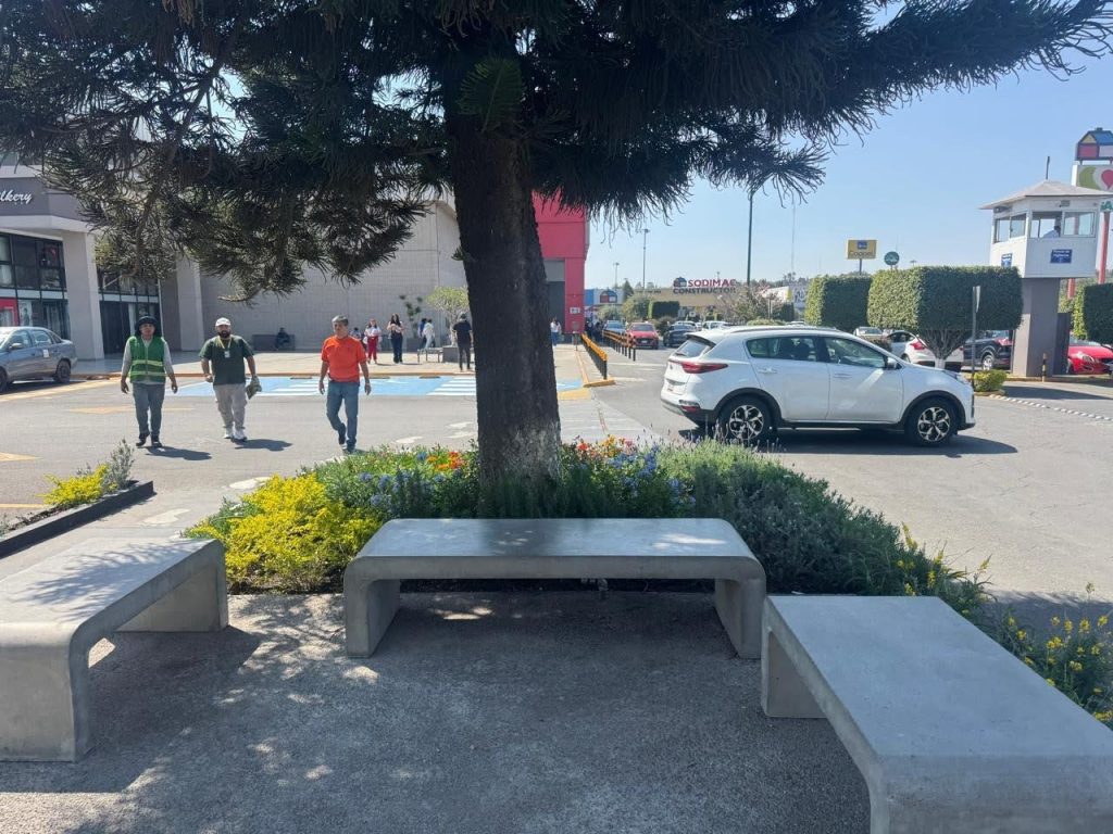 La intervención demuestra que incluso en entornos comerciales dominados por el automóvil, es posible crear pequeños oasis urbanos: lugares donde la movilidad y la estancia coexisten, donde el concreto convive con la sombra y donde el peatón recupera su protagonismo.